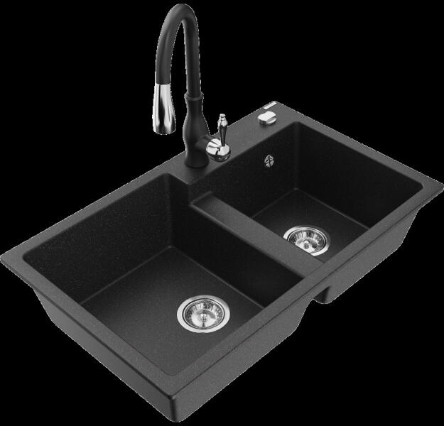 NERO Verso gránit mosogatótálca bézs színben csapteleppel és automata dugókiemelővel. Kétmedencés, szimmetrikus elrendezésű mosogató, kellően nagyméretű medencékkel, a 75 cm-es szélesség egyszerre tágas és helytakarékos is. Letisztult formatervezés, kiemelkedő anyagvastagság jellemzi, ezáltal rendkívül masszív és ellenálló konstrukció. Anyaga 80% gránit őrlemény