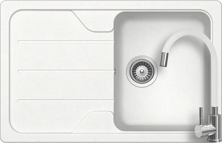 Mosogató Sorozat: Enzo Modell: 1 kamrás Beépítés: a munkalapba való beágyazáshoz Mosogató méretei: 576 x 465 x 174 mm Kamra mérete: 395 x 320 mm Kamra mélysége: 164 mm Lefolyó átmérője: 90 mm Szifon + automatikus leeresztő csavar Anyaga: gránit (80% gránit - kő, 20% gyanta) A sima felület könnyen tisztítható: igen Megnövelt ellenállás az ütésekkel, karcolásokkal, els