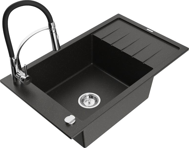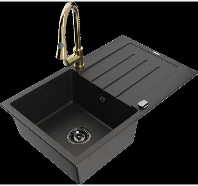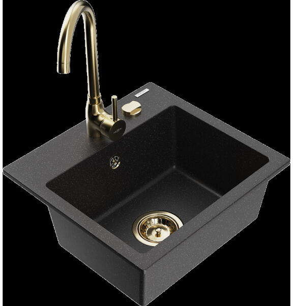 Mexen Elias konyhai mosogató: Gyártó: Mexen Sorozat: Elias Modell: 1 kamrás Beépítés: felülről a munkalapba süllyesztve Szín: fekete - arany metál Méretek: 795x480x200 mm Kamra mélysége: 190 mm Kamra mérete: 465x420 mm Lefolyó átmérője: 90 mm Szifon + automatikus leeresztő csavar Anyaga: gránit (80% gránit - kő, 20% gyanta) Sima felület a könnyű tisztítás érdekében: