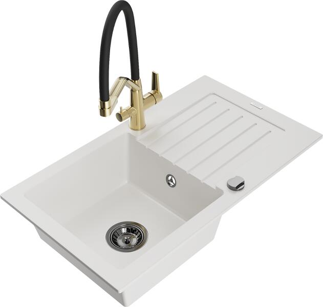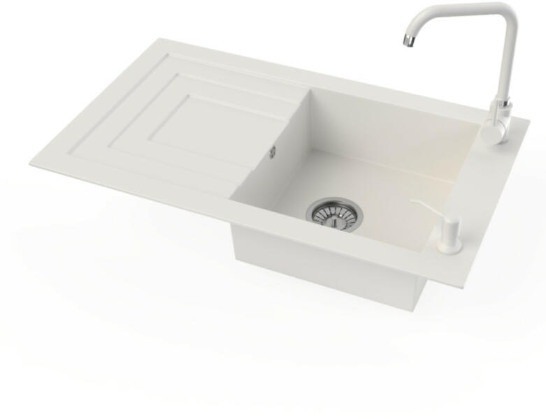 Nero Cortina gránit mosogató fehér színben. A teljes készlet tartalmazza a mosogatót, a csaptelepet, a szifonkészletet és a mosogatószer adagolót. A csaptelep és az adagoló a medence külső peremén helyezkedik el, így biztosítva több helyet és jobb hozzáférést a csepegtető részhez, mindemellett modernebb megjelenést is eredményez. Letisztult, szögletes formavilág jellemz