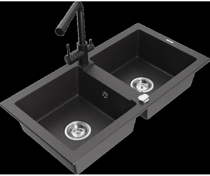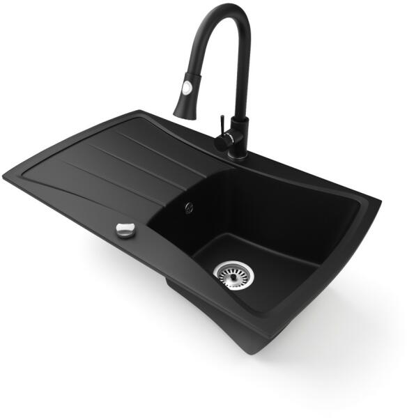 NERO Venezia gránit mosogató matt fekete színben. Egyedi és különleges formával tervezett egymedencés mosogató, kellően nagyméretű csepegtető résszel. A velencei gondolákat idéző, harmonikusan kialakított ívekkel a konyha esztétikus része, emellett anyagvastagságának köszönhetően rendkívül masszív konsktrukció. A mosogatón 2 lyuk található, egy a csaptelepnek és e