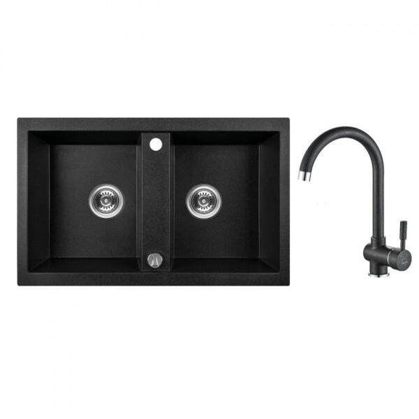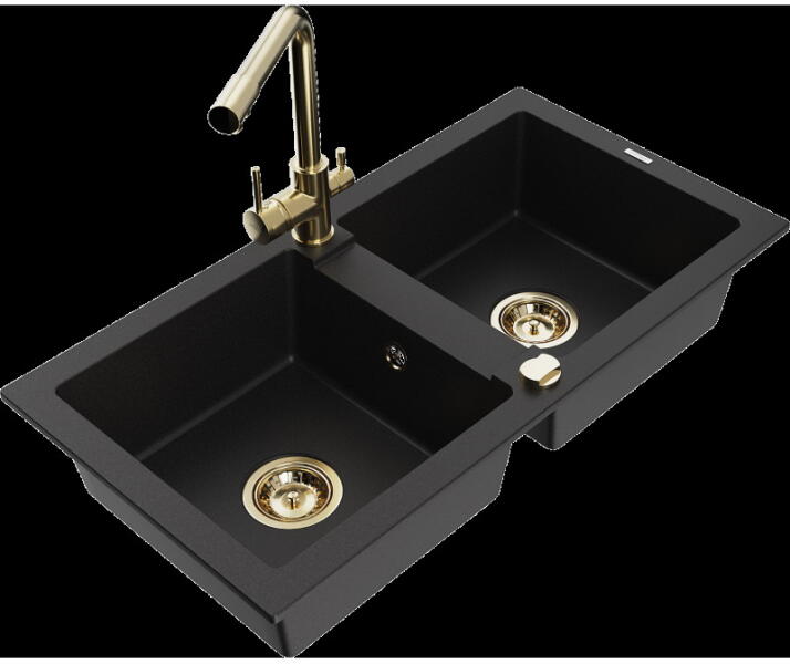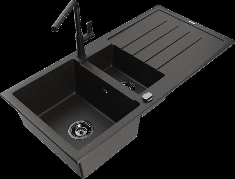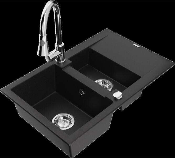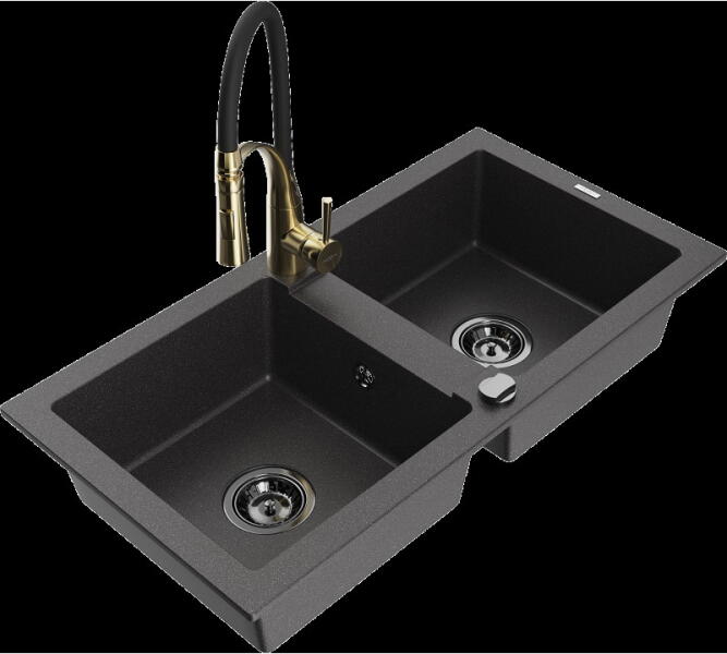 Laveo BARBADOS - EXKLUZÍV kétmedencés gránit mosogatótál + ÍVES ÁLLÓ CSAPTELEP szett Tiszta vonalvezetésű korszerű design, célszerű és kényelmes munkavégzés Laveo BARBADOS gránit mosogatótál Ajándék automata dugókiemelő Ajándék: 3,5"-os exkluzív rozsdamentes szűrőkosár Ajándék: helytakarékosszifon szett. Íves álló kerámiabetétes csaptelep forgatható kifolyó
