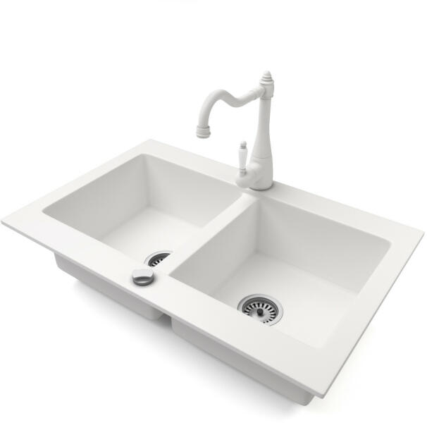 NERO Verso gránit mosogatótálca fehér színben csapteleppel és automata dugókiemelővel. Kétmedencés, szimmetrikus elrendezésű mosogató, kellően nagyméretű medencékkel, a 75 cm-es szélesség egyszerre tágas és helytakarékos is. Letisztult formatervezés, kiemelkedő anyagvastagság jellemzi, ezáltal rendkívül masszív és ellenálló konstrukció. Anyaga 80% gránit őrlemén