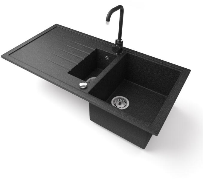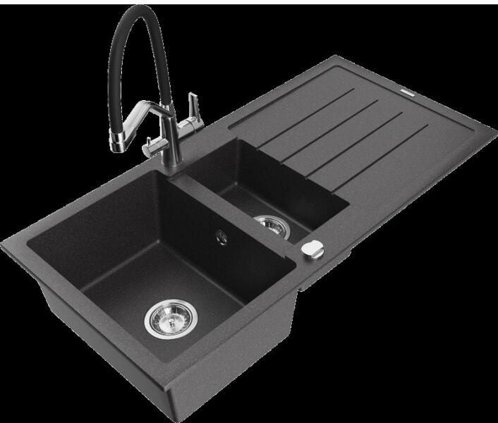 Nero Solarys a másfél medencés mosogatótálcák csúcsmodellje, a 100 cm-es hosszúságával könnyen helyet ad egy nagyméretű medencének, egy szintén nagyméretű csepegtető résznek és egy kisebb gyümölcsmosónak. Letisztult, modern formájával minden konyha kiemelkedő eleme lehet. A két medence lehetővé teszi párhuzamosan a mosogatást, öblítést vagy csak a vízben tartást