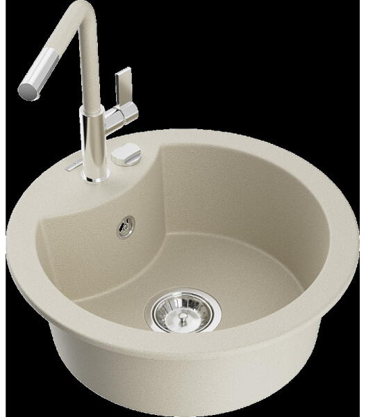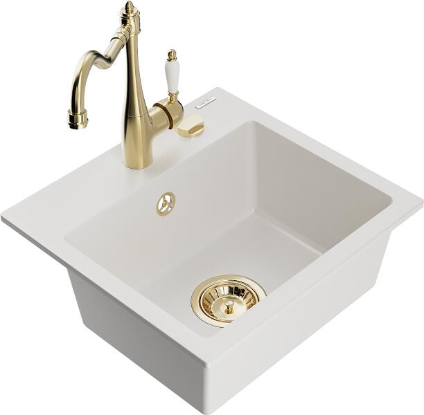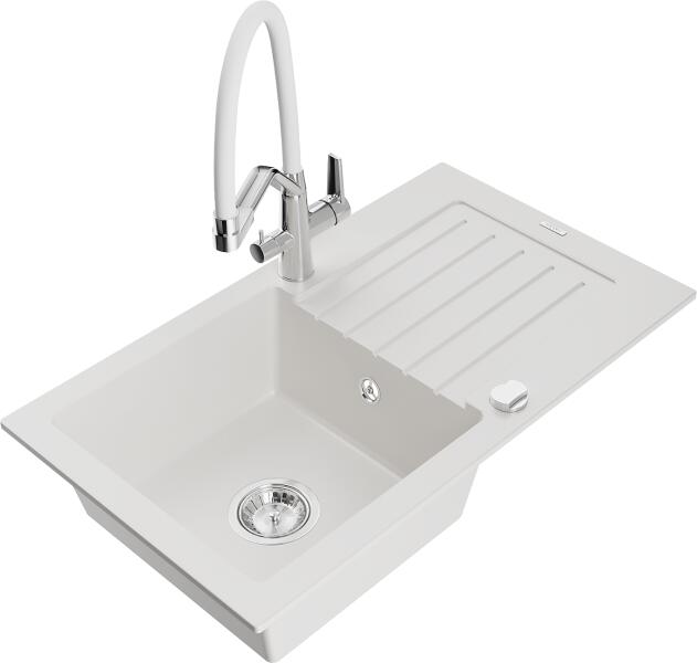 Mexen Milo, gránit mosogató 435x410x171 mm, 1 kamrás és mosogató csaptelep Carla, fehér, 6505-20-670700-50 Milo konyhai mosogató: Gyártó: Mexen Fehér szín Méretek: 435x410x171 mm Kamra mélysége: 161 mm Kamra méretei: 375x280 mm Lefolyó átmérője: ø90 mm Típus: 1 kamrás Beépítés: felülről a pultba süllyesztve Anyaga: gránit (80% gránit adalékanyag 20% gyanta) Túlfoly