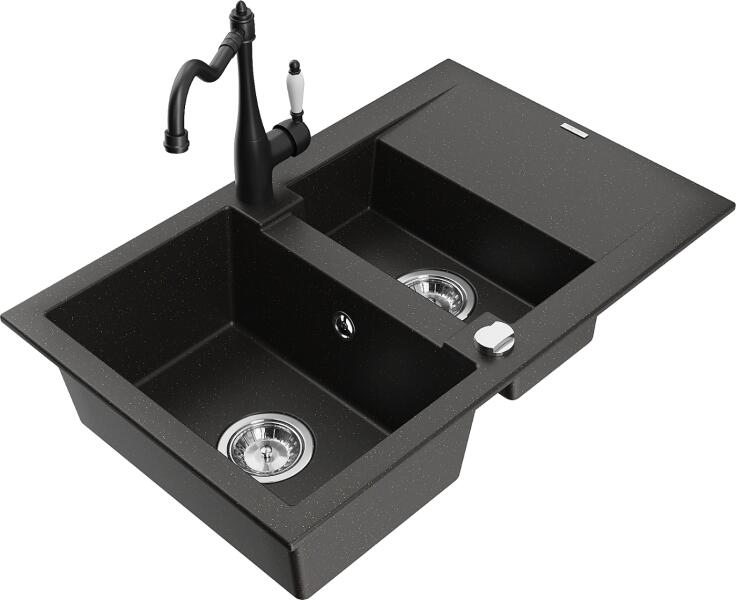 Mexen Carlos, gránit mosogató 582x475x177 mm, 1,5 kamrás és mosogató csaptelep Carla, fekete, 6518-77-670700-50 Műszaki adatok: Gyártó: Mexen Sorozat: Carlos Modell: 1,5-kamrás csepptálca nélkül Beépítés: felülről a munkalapba süllyesztve Fekete szín Hossza 582 mm Szélesség 475 mm Magasság: 177 mm Kamra mélysége: 162 mm (nagyobb), 102 mm (kisebb) Kamra mérete: 395x272 mm (
