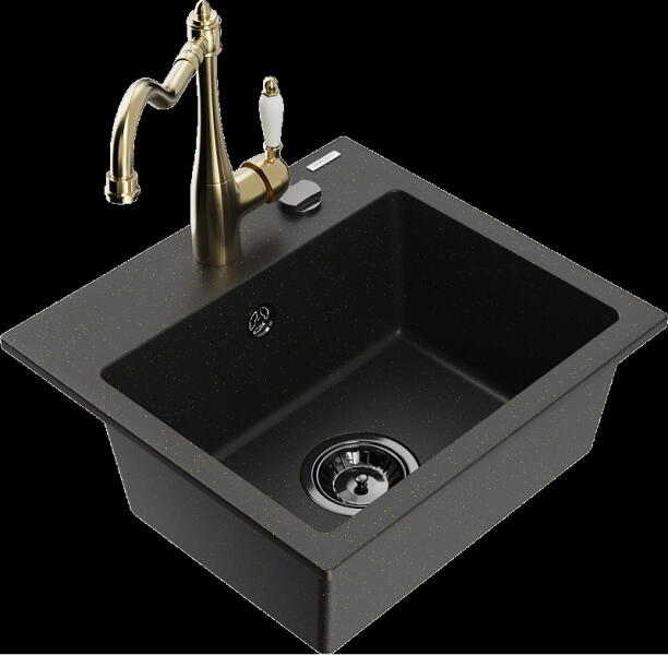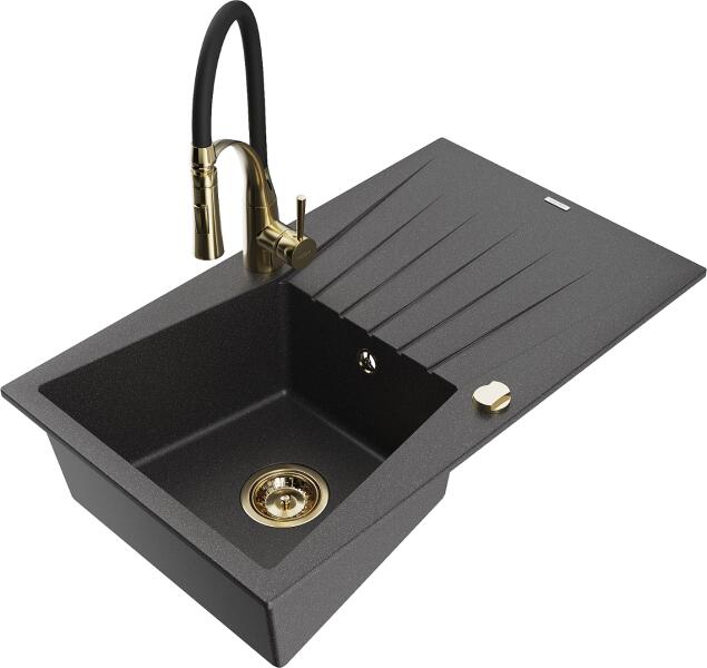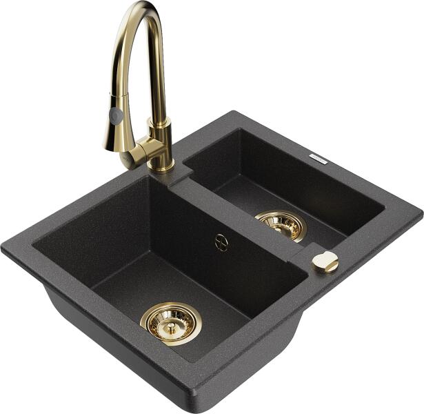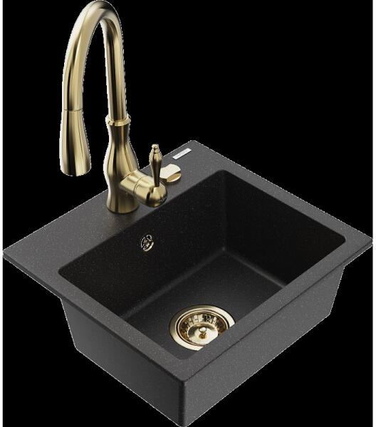 Mexen Gaspar, gránit mosogató 752x436x161 mm, 1,5 kamrás és Carla mosogató csaptelep, fekete-arany metál, 6507-75-670700-70 Gyártó: Mexen Sorozat: Gáspár Modell: 1,5-kamrás, rövid leeresztővel Beépítés: felülről a munkalapba való beágyazáshoz Szín: fekete - arany metál Hossza 737 mm Szélesség 475 mm Magasság: 177 mm Kamra mélysége: 167 mm (nagyobb), 107 mm (kisebb) Kamr