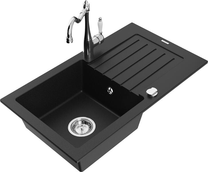 Mexen Pablo, 1 kamrás gránit mosogató 752x436x161 mm és mosogató csaptelep Carla, fekete, 6510-77-670700-00 Gyártó: Mexen Sorozat: Pablo Méretek: 752x436x161 mm Kamra mélysége: 151 mm Kamra méretei: 356x332 mm Lefolyó átmérője: ø90 mm Fekete szín Típus: 1 kamrás csepegtetővel Típus: felülről a pultba süllyesztve Anyaga: gránit (80% gránit adalékanyag 20% gyanta) Túlfoly