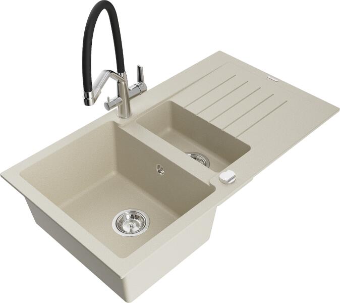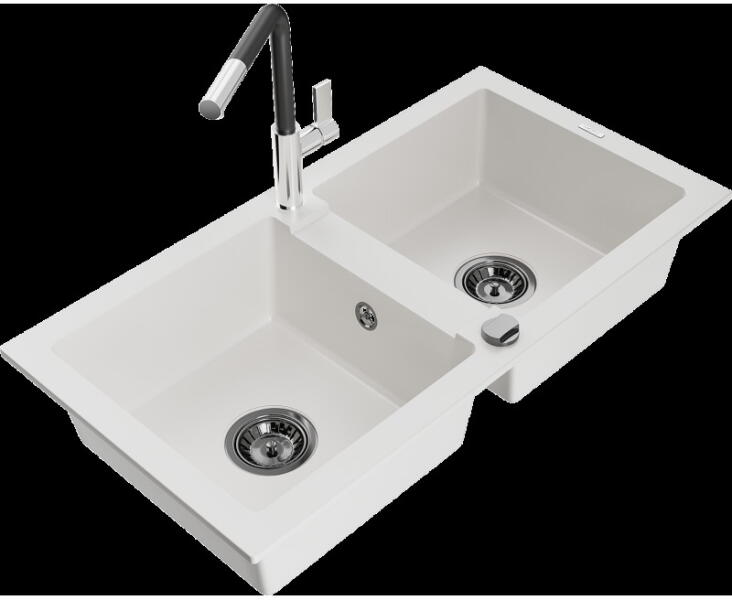 Gyártó: Mexen Sorozat: Andres + Savita Mosogató: Méretek: 1000x500x200 mm Kamra méretei: 430x330 mm (nagyobb), 340x170 mm (kisebb) Kamra mélysége: 190 mm (nagyobb), 115 mm (kisebb) Lefolyó átmérője: ø90 mm Típus: 1,5-kamrás lefolyóval Mosogató típusa: a munkalapba való beágyazáshoz Anyaga: gránit (80% gránit adalékanyag 20% gyanta) Túlfolyó nyílás: Igen Lyukak: 2 (1 lyuk