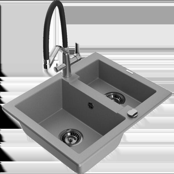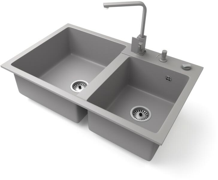 NERO Palazzo gránit mosogatótálca szürke színben csapteleppel, automata dugóemelővel és adagolóval. A kétmedencés mosogatótálcák 21. századi csúcsmodellje, ami két nagyméretű medencéjével és különleges kialakításával minden konyha tökéletes eleme lehet. Az asszimetrikus kialakításnak köszönhetően a kisebb medence fölött egy praktikus perem helyezkedik el, ahol h