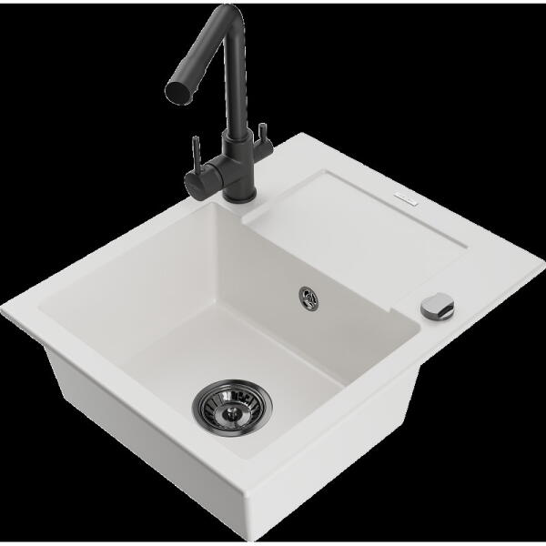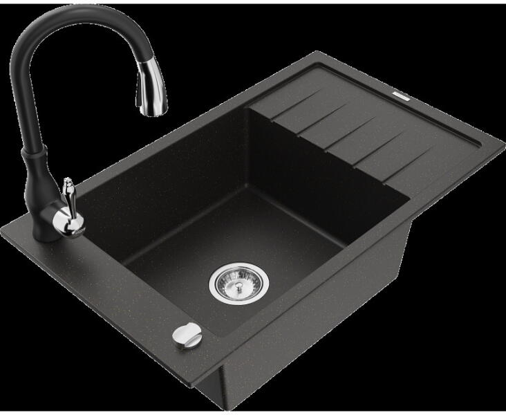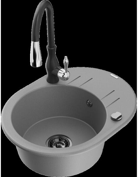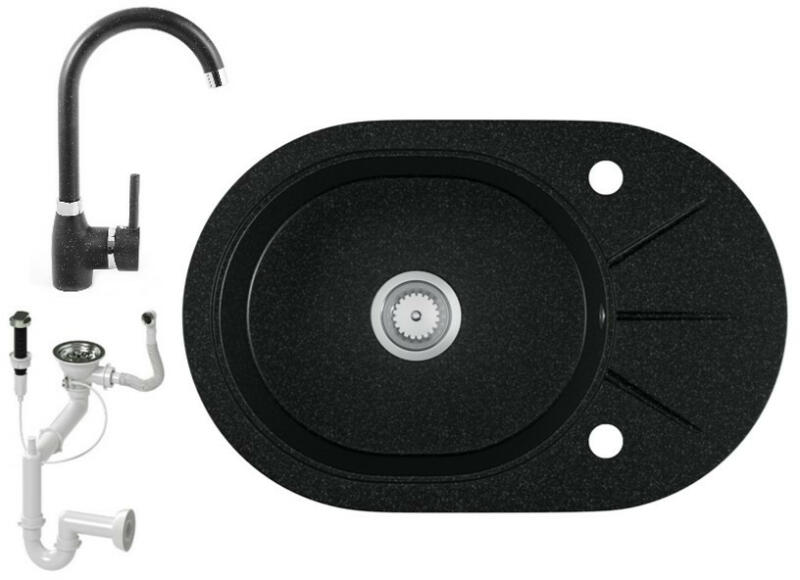 Laneo ZIA gránit mosogató szett fekete színben. Teljes készlet, ami tartalmazza a magasított csaptelepet, a beépített mosogatószer adagolót és a szifon készletet. Ovális kialakítású, egyedi megjelenésű mosogató, méretes, 44,5 x 37 cm-es medencével, ami 19 cm mély. Egyszerre stílusos és kiválóan alkalmas nagyobb edények mosogatására is. CSOMAG TARTALMA: - Gránit mosogat