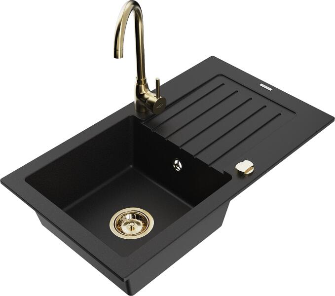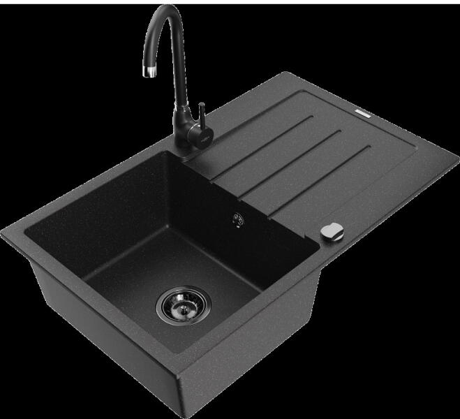 Mexen Pablo, 1 kamrás gránit mosogató csepegtetővel 75x44 cm konyhai csapteleppel Telma, fekete, 6510-77-670200-50 Mosogató: Termékkód: 6510751010-77 Mérete: 752x436x161 mm Kamra mélysége: 151 mm Kamra méretei: 356x332 mm Lefolyó átmérője: ø90 mm Típus: 1 kamrás csepptálcával Típus: Az asztallapba süllyesztett Fekete szín Anyaga: gránit (80% gránit adalékanyag 20% gyanta)