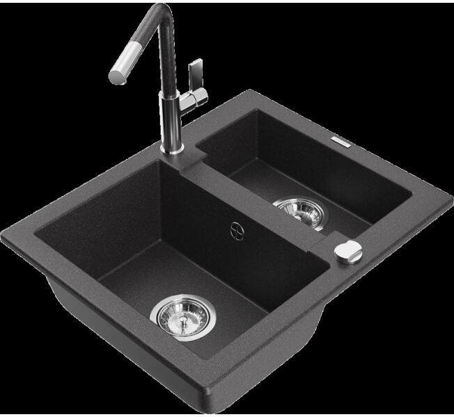 Mexen Tomas, gránit mosogató 800x500x190 mm, 2 kamrás és Rita króm csaptelep, fekete foltos, 6516-76-670300-00 A konyhai mosogató műszaki adatai: Gyártó: Mexen Sorozat: Tomas Modell: 2-kamrás csepptálca nélkül Felszerelés: munkalapra Szín: fekete foltos Felület: sima Hossza 800 mm Szélesség 500 mm Magasság: 190 mm Kamra mélysége: 180 mm (nagyobb), 180 mm (kisebb) Kamra méret