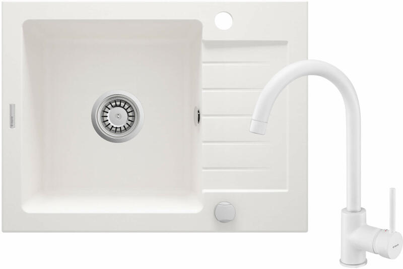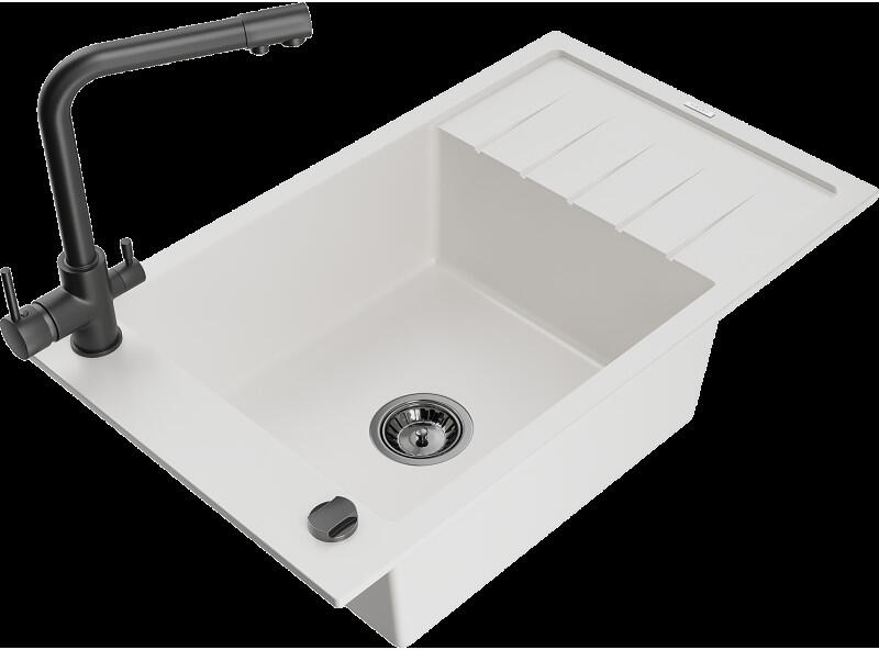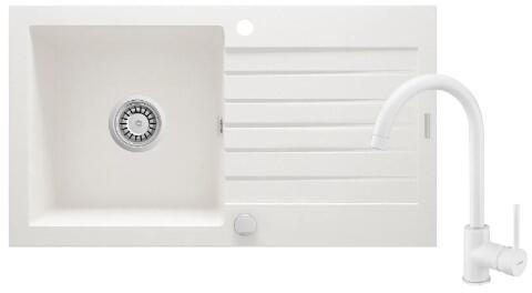 1 medencés, gránit mosogató csepegtetővel, csapteleppel|Kivitelezés: alabástrom|Beszerelési mód: süllyesztett|Minimális szekrényszélesség: 500 mm|Hosszúság: 760 mm|Szélesség: 440 mm|Magasság: 160 mm|Mosogatógép-csatlakozással ellátott szerelvényekkel felszerelt mosogató|Automatikus lefolyóelzárással ellátott szifonok|Alabástrom színű csaptelep|Csaptelep típusa: egyk