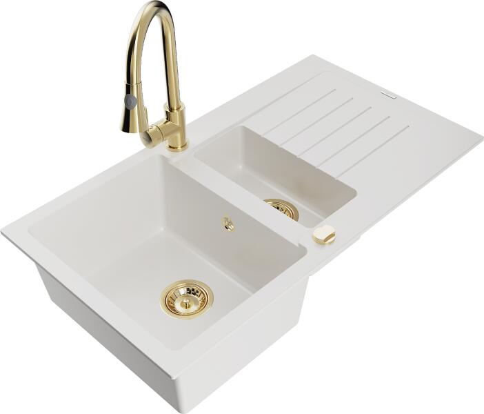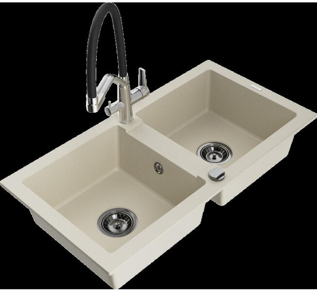 Mexen Mario, 2 kamrás gránit mosogató 820x436x161 mm és Telma arany fényes mosogató csaptelep, bézs, 6504-69-670200-50 Gyártó: Mexen Sorozat: Mario Termékkód: 6504822000-69 Szín: bézs Mérete: 820x436x161 mm Kamra mélysége: 151 mm Kamra méretei: 356x336 mm Lefolyó átmérője: ø90 mm Típus: 2 kamrás Típus: a pultba süllyesztve Anyaga: gránit (80% gránit adalékanyag 20% gya
