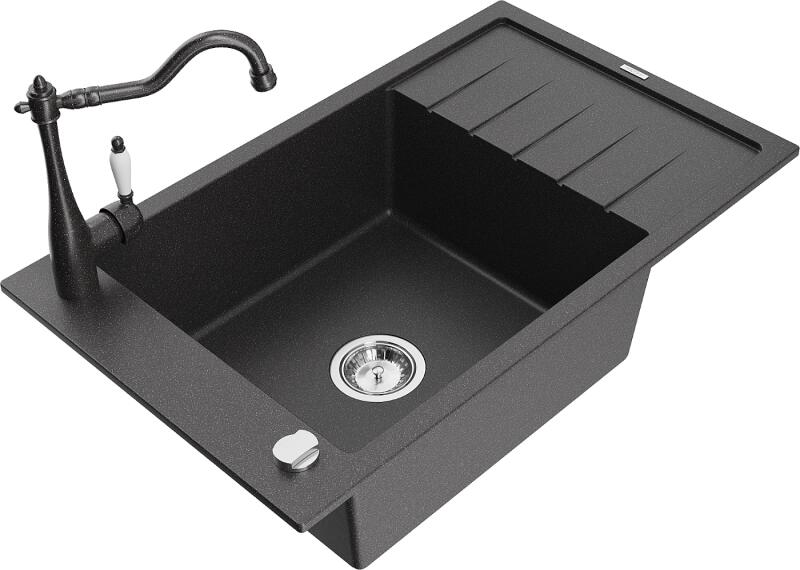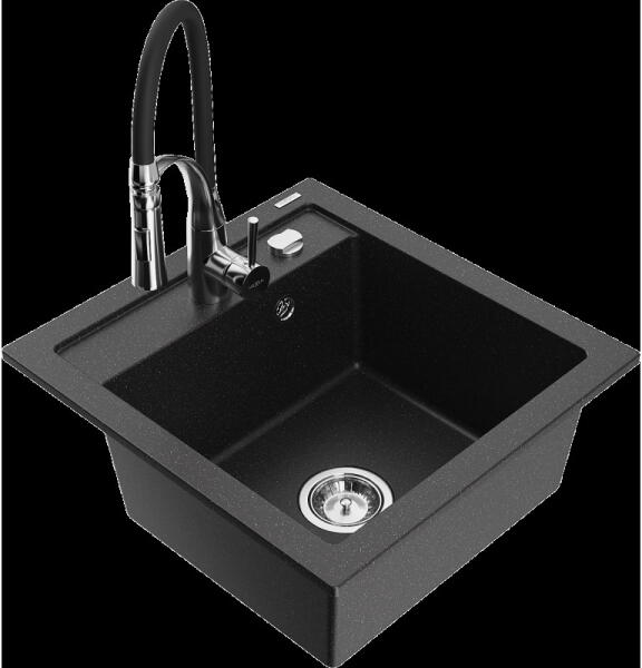 Mexen Elias, gránit mosogató 795x480x200 mm, 1 kamrás és mosogató csaptelep Carla, fekete foltos, 6511-76-670700-76 Elias konyhai mosogató: Szín: fekete foltos Méretek: 795x480x200 mm Kamra mélysége: 190 mm Kamra méretei: 465x420 mm Lefolyó átmérője: ø90 mm Típus: 1 kamrás, rövid csepegtetővel Beépítés: felülről a munkalapba süllyesztve Anyaga: gránit (80% gránit adalé