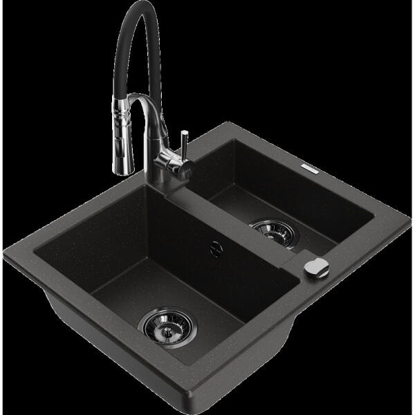 Mexen Gaspar, 1,5 kamrás gránit mosogató csepptálcával 74x48 cm konyhai csaptelep Telma, fekete, 6507-77-670200-00 Mosogató: Termékkód: 6507731505-20 Mérete: 737x475x177 mm Kamra mélysége: 167 mm (nagyobb), 107 mm (kisebb) Kamra méretei: 395x272 mm (nagyobb), (kisebb) 375x182 mm Lefolyó átmérője: ø90 mm Típus: 1,5-kamrás, rövid csepegtetőtálcával Típus: Az asztallapba süll