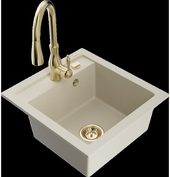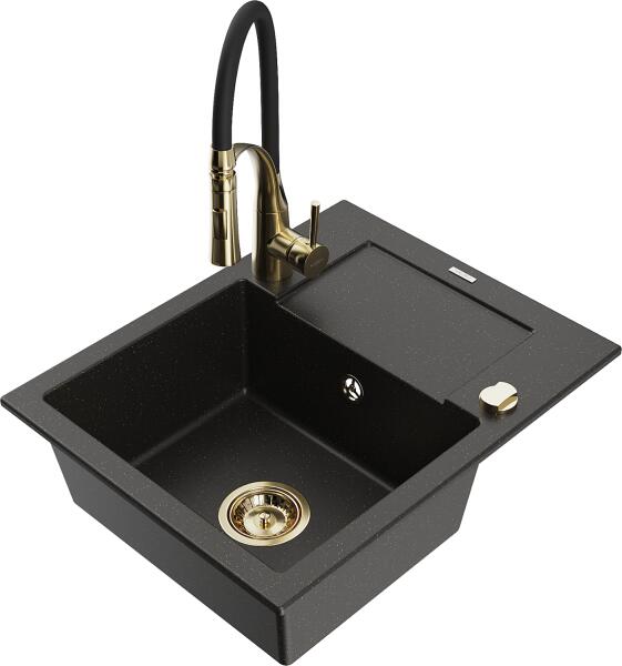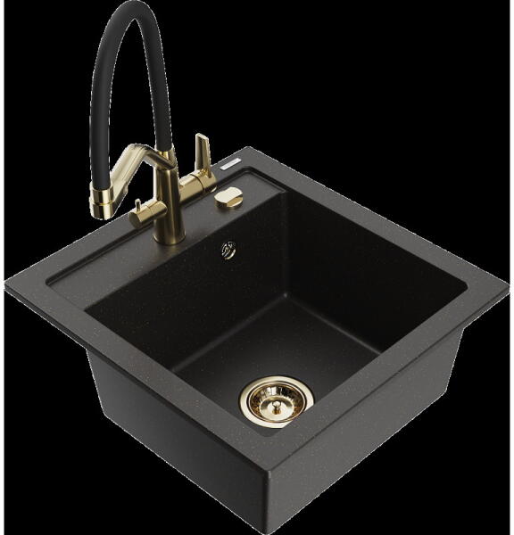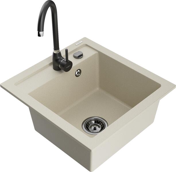Mexen Vito, 1 kamrás gránit mosogató 520x490x210 mm, fekete Telma csaptelep, bézs, 6503-69-670200-70 Mosogató: Mérete: 520x490x210 mm Kamra mélysége: 200 mm Kamra méretei: 410x360 mm Lefolyó átmérője: ø90 mm Típus: 1 kamrás Típus: Az asztallapba süllyesztett Szín: bézs Anyaga: gránit (80% gránit adalékanyag 20% gyanta) Túlfolyó nyílás: Igen Lyukak: (akkumulátor, gép) 2