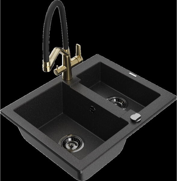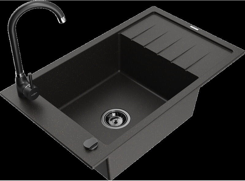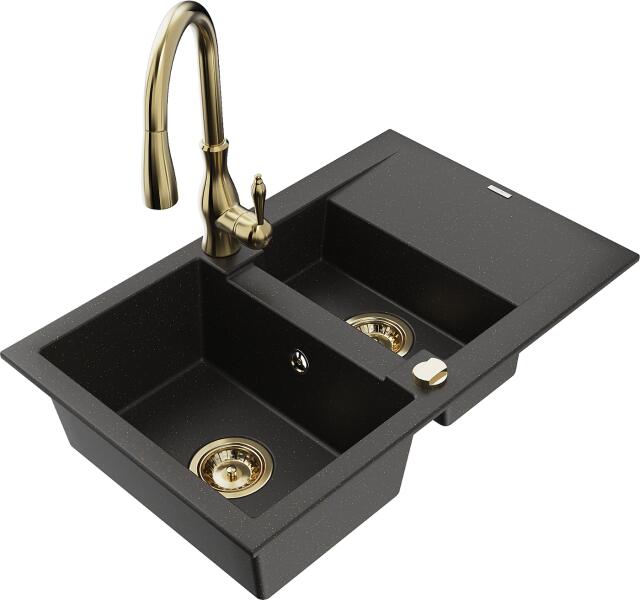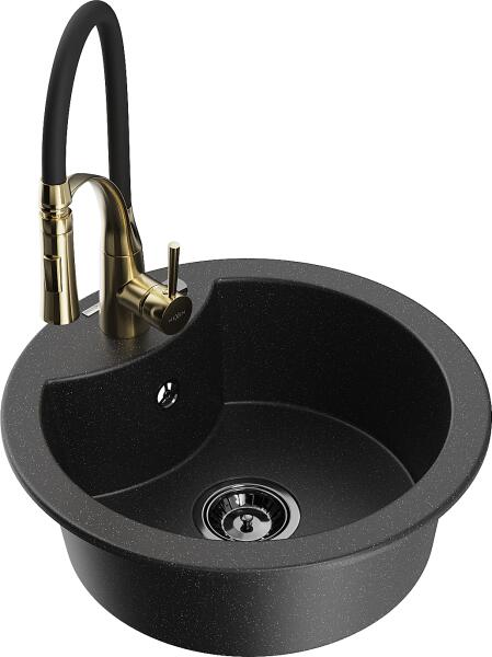 Mexen Enzo, gránit mosogató 576x465x174 mm, 1 kamrás, Rita arany csaptelep, fekete, 6506-77-670300-50-B Gyártó: Mexen Sorozat: Enzo Modell: 1 kamrás, rövid csepegtetővel Hossza 576 mm Szélesség 465 mm Magasság: 174 mm Fekete szín Kamra mélysége: 164 mm Kamra mérete: 395x320 mm Szifon + automatikus leeresztő csavar Anyaga: gránit (80% gránit - kő, 20% gyanta) Megnövelt ellenáll