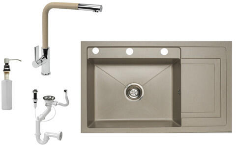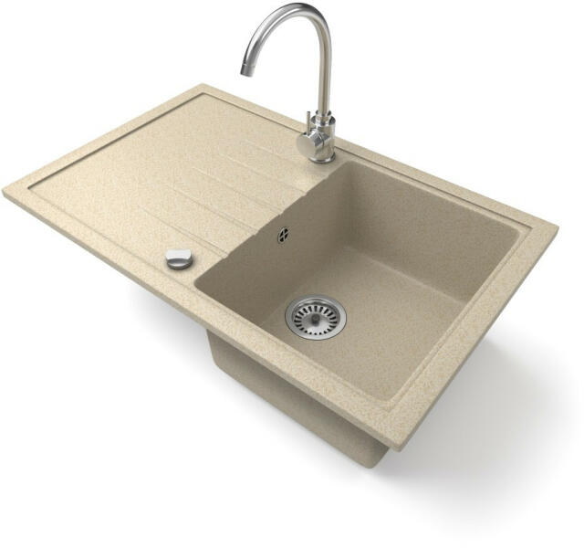 Vancouver gránit mosogató szett bézs színben, extra nagy medencés kivitelben. A 38,5 x 48,5 cm-es nagyméretű medence és a csepegtető megkönnyíti a nagyobb edények, lábosok elmosását. A két lyuk felül helyezkedik el, így kényelmes a csap és az adagoló használata. A letisztult szögletes formavilág kiválóan illeszkedik egy modern stílusú konyhába. Ez a mosogató csak ebbe