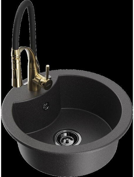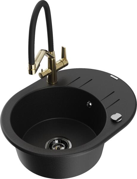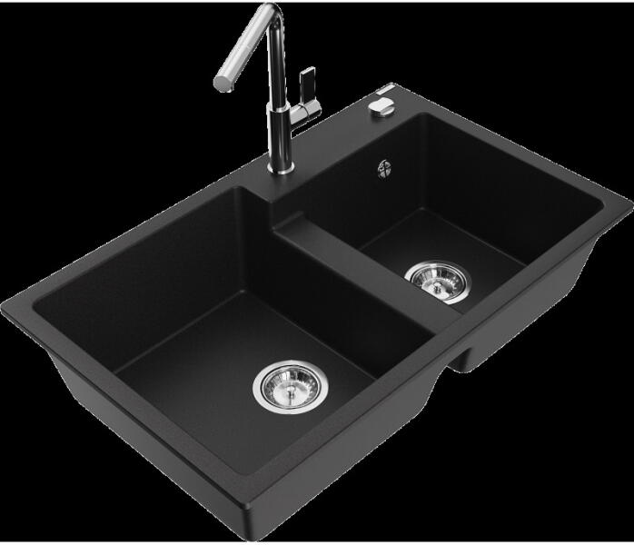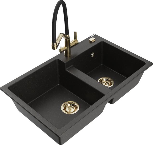 Mexen Tomas, 2 kamrás gránit mosogató 800x500x190 mm és konyhai csaptelep Duo, fekete-arany metál, 6516-75-671701-57-G A konyhai mosogató műszaki adatai: Gyártó: Mexen Sorozat: Tomas Modell: 2-kamrás csepptálca nélkül Felszerelés: munkalapra Szín: fekete - arany metál Felület: sima Hossza 800 mm Szélesség 500 mm Magasság: 190 mm Kamra mélysége: 180 mm (nagyobb), 180 mm (kiseb