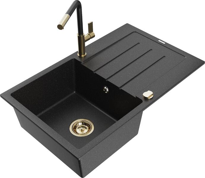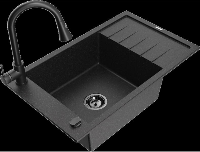 Mexen Elias, 1 kamrás gránit mosogató csepptálcával 80x48 cm Telma konyhai csapteleppel, fekete foltos, 6511-76-670200-76 Mosogató: Termékkód: 6511791005-76 Mérete: 795x480x200 mm Kamra mélysége: 190 mm Kamra méretei: 465x420 mm Lefolyó átmérője: ø90 mm Típus: 1-kamrás, rövid csepptálcával Típus: Az asztallapba süllyesztett Szín: fekete, ezüst pöttyökkel Anyaga: gránit