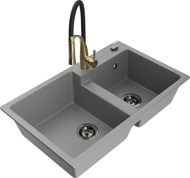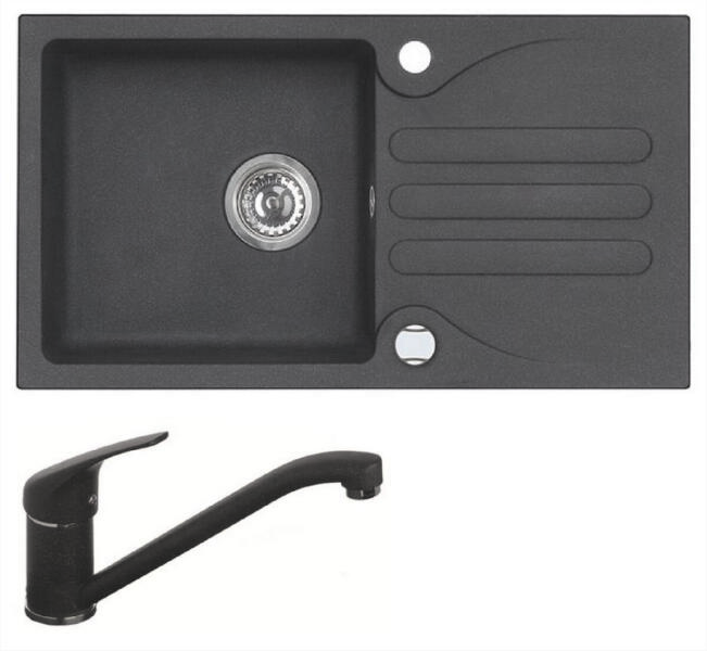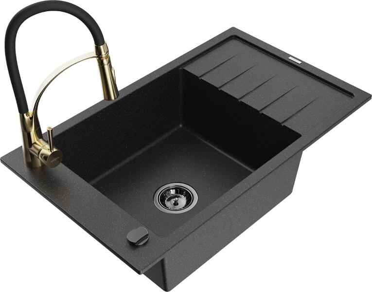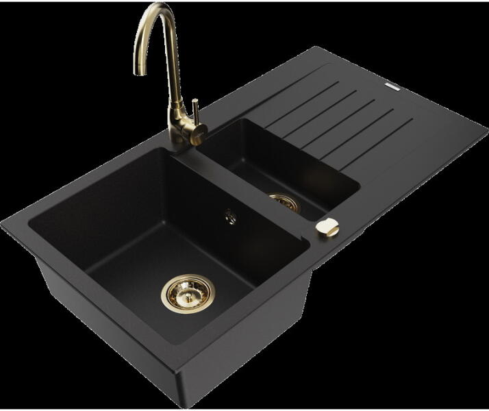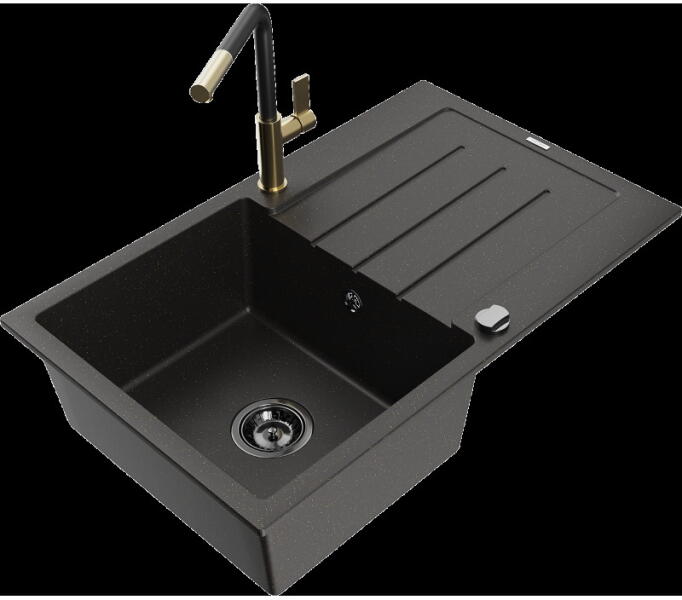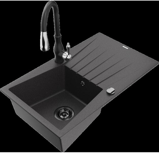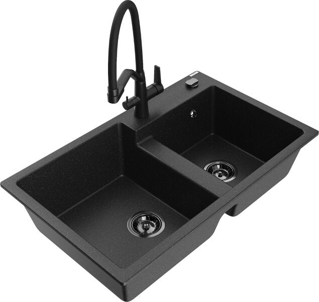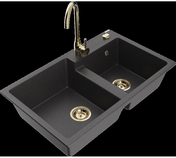 Mexen Tomas, 2 kamrás gránit mosogató 800x500x190 mm és konyhai csaptelep Duo, fekete-ezüst metál, 6516-73-671701-70-B A konyhai mosogató műszaki adatai: Gyártó: Mexen Sorozat: Tomas Modell: 2-kamrás csepptálca nélkül Felszerelés: munkalapra Szín: fekete - ezüst metál Felület: sima Hossza 800 mm Szélesség 500 mm Magasság: 190 mm Kamra mélysége: 180 mm (nagyobb), 180 mm (kis
