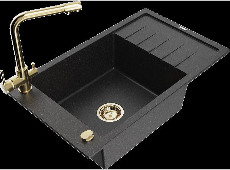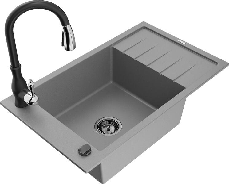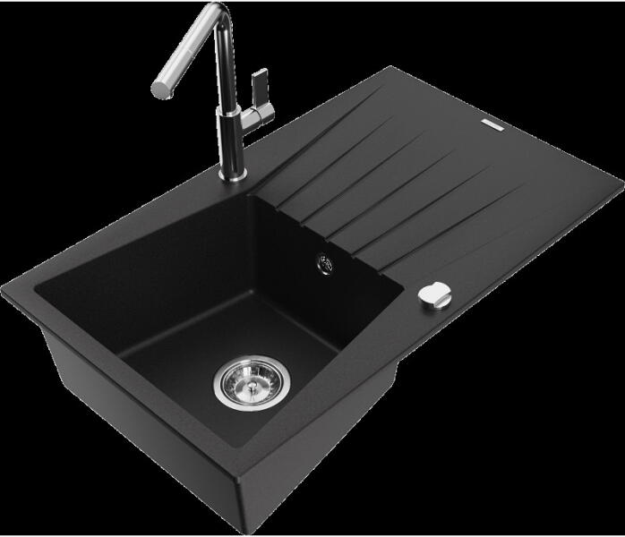 Mexen Elias konyhai mosogató: Gyártó: Mexen Sorozat: Elias Modell: 1 kamrás Beépítés: felülről a munkalapba süllyesztve Méretek: 795x480x200 mm Kamra mélysége: 190 mm Kamra mérete: 465x420 mm Lefolyó átmérője: 90 mm Szifon + automatikus leeresztő csavar Anyaga: gránit (80% gránit - kő, 20% gyanta) Sima felület a könnyű tisztítás érdekében: igen Megnövelt ellenállás