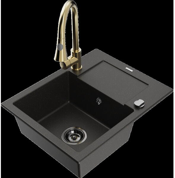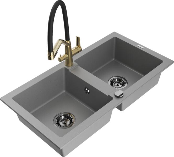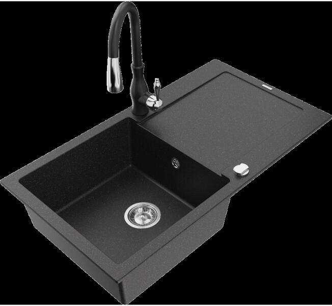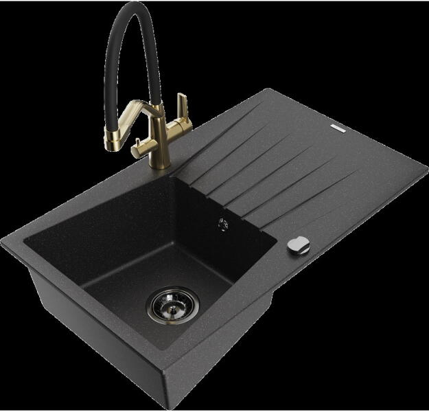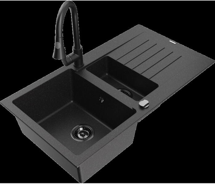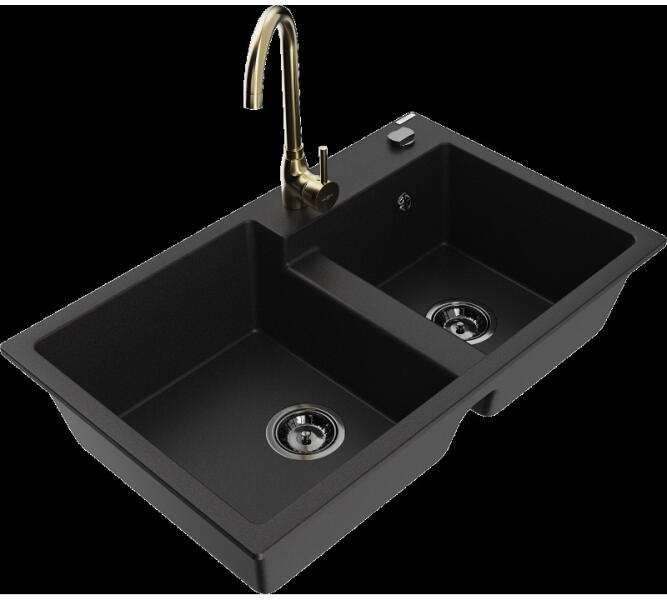 Mexen Mario konyhai mosogató: Méretek: 820x436x161 mm Kamra mélysége: 151 mm Kamra méretei: 356x336 mm Lefolyó átmérője: ø90 mm Típus: 2 kamrás Típus: felülről az asztal munkalapjába süllyesztve Anyaga: gránit (80% gránit adalékanyag 20% gyanta) Túlfolyó lyuk: igen Lyukak: 2 (1 x mosogató csaptelep, 1 x automatikus leeresztő csavar vezérlés) Nagy ellenállás a karc