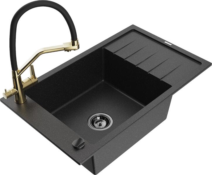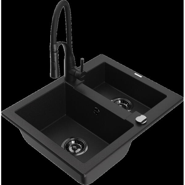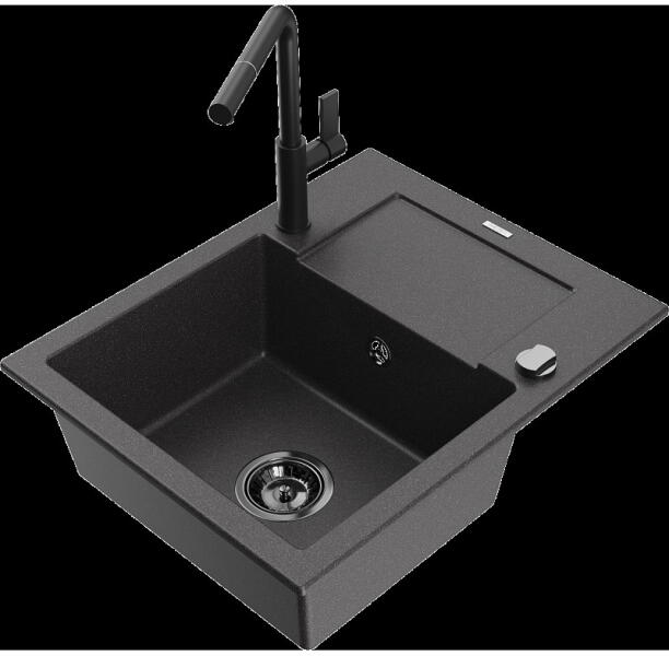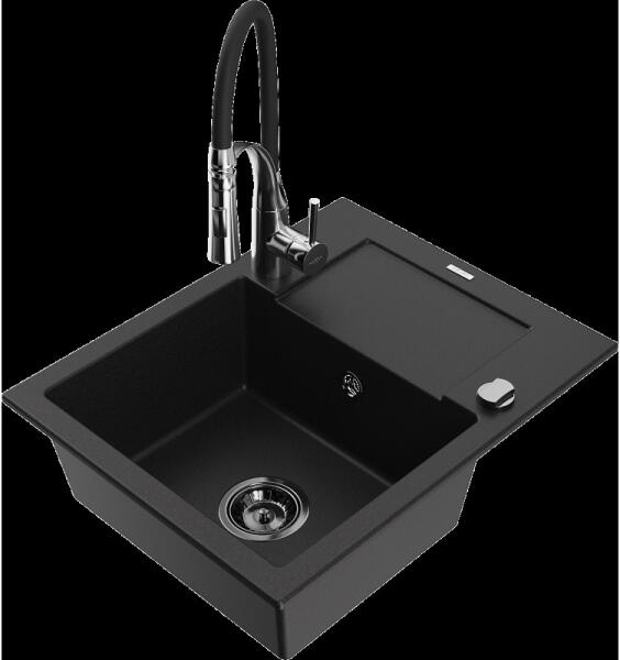 Mexen Kevin, gránit mosogató 586x458x190 mm, 1 kamrás és Carla mosogató csaptelep, fekete-ezüst metál, 6517-73-670700-70 Gyártó: Mexen Sorozat: Kevin Szín: fekete/ezüst metál Modell: 1 kamrás, rövid leeresztővel Felszerelés: munkalapra Hossza 586 mm Szélesség 458 mm Magasság: 190 mm Kamra mérete: 378x374 mm Kamra mélysége: 175 mm A lefolyó átmérője: Ø 90 mm Szifon + auto
