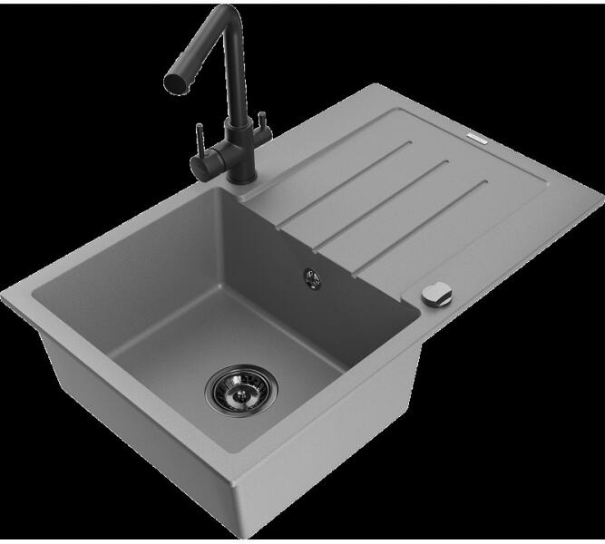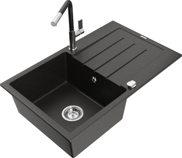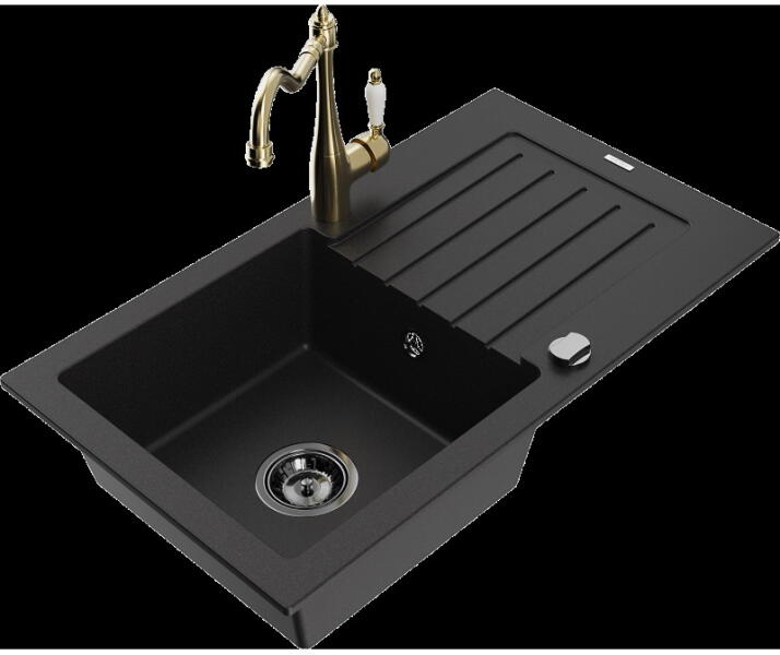 Elias konyhai mosogató, 795x480x200 mm, 1 kamrás Gyártó: Mexen Sorozat: Elias Típus: 1 kamrás, rövid csepegtetővel Méretek: 795x480x200 mm Kamra mélysége: 190 mm Kamra méretei: 465x420 mm Lefolyó átmérője: ø90 mm Beépítés: felülről a munkalapba süllyesztve Anyaga: gránit (80% gránit adalékanyag 20% gyanta) Túlfolyó lyuk: igen Lyukak: 2 (1 x akkumulátor, 1 x autom