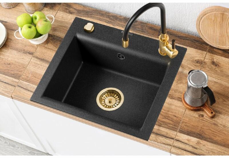 Invena Tesalia, 1 kamrás gránit mosogató 440x480x160 mm és Glamour mosogató csaptelep, fekete-arany, INV-AZ-01-Z41-SET Gyártó: Invena Sorozat: Thessaly Típus: konyhai mosogató + mosogató csaptelep Beépítés: felülről a munkalapba süllyesztve A kádak száma: 1 Anyaga: gránit Méretek: 440 x 480 mm Mélység: 160 mm Minimális szélességű szekrényekhez: 450 mm Gyárilag előkész