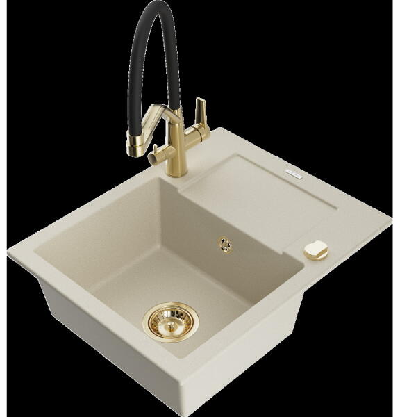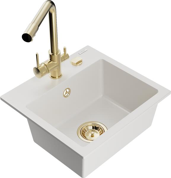 Mexen Milo, gránit mosogató 435x410x171 mm, 1 kamrás és arany Duero csaptelep, fehér, 6505-20-671600-50 A konyhai mosogató műszaki adatai: Gyártó: Mexen Sorozat: Milo Modell: 1 kamrás Felszerelés: munkalapra Fehér szín Hossza 435 mm Szélesség 410 mm Magasság: 171 mm Kamra mélysége: 161 mm Kamra mérete: 375x280 mm Lefolyó átmérője: Ø 90 mm Szifon + automatikus leeresztő An