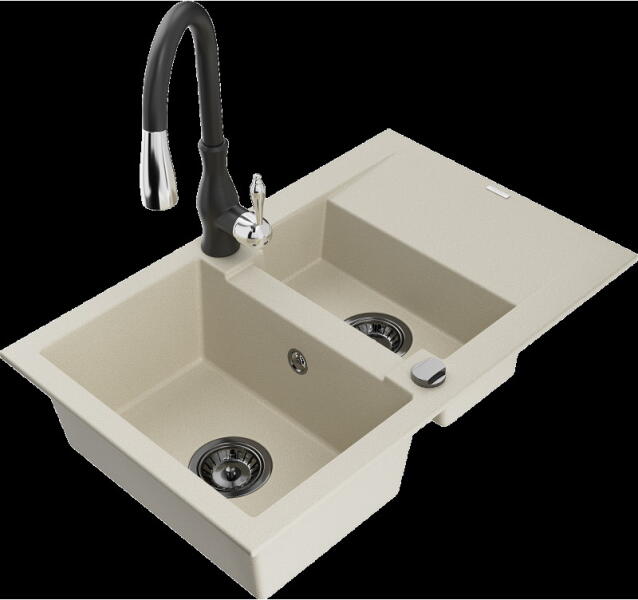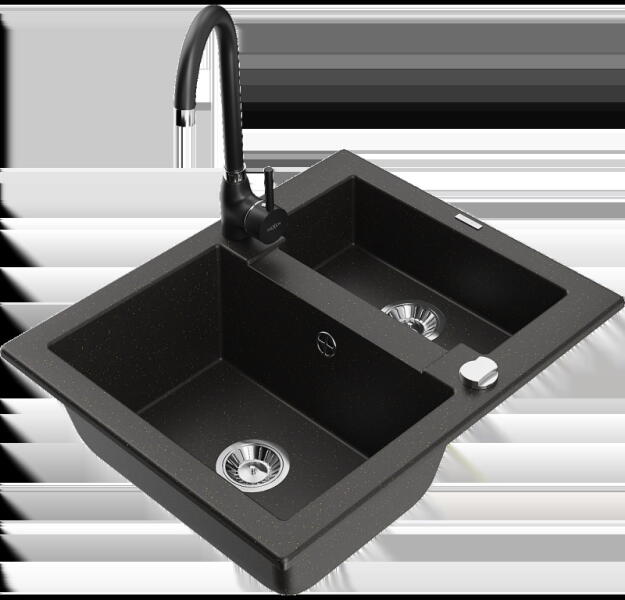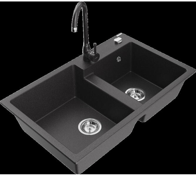 Mexen Mario, 2-kamrás gránit mosogató 820x436x161 mm és Duero króm mosogató csaptelep, fekete-ezüst metál, 6504-73-671600-00 Gyártó: Mexen Sorozat: Mario Termékkód: 6504822000-73 Szín: fekete - ezüst metál Mérete: 820x436x161 mm Kamra mélysége: 151 mm Kamra méretei: 356x336 mm Lefolyó átmérője: ø90 mm Típus: 2 kamrás Típus: a pultba süllyesztve Anyaga: gránit (80% grá