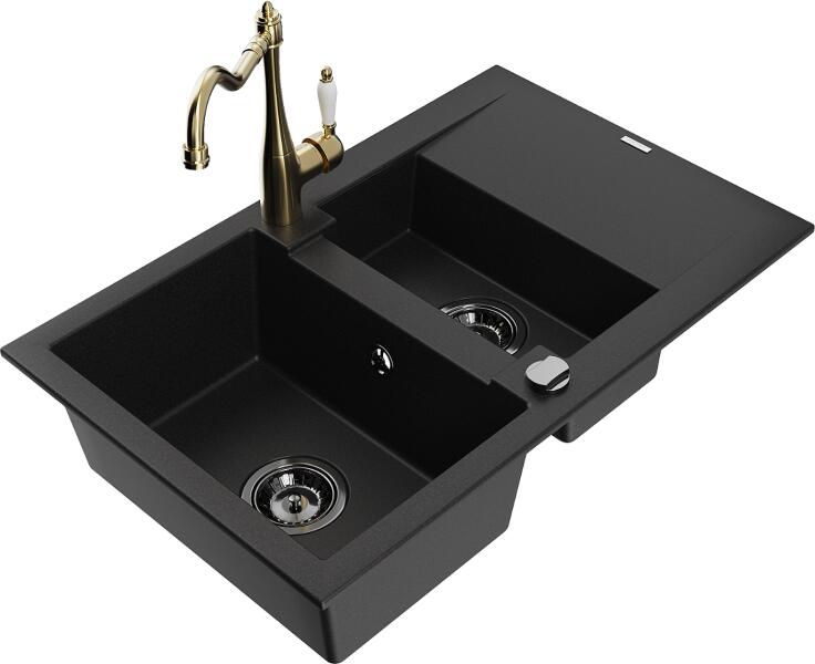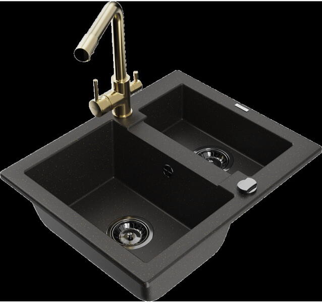 Mexen Tomas, gránit mosogató 800x500x190 mm, 2 kamrás és fekete Rita csaptelep, fekete-ezüst metál, 6516-73-670300-70 A konyhai mosogató műszaki adatai: Gyártó: Mexen Sorozat: Tomas Modell: 2-kamrás csepptálca nélkül Felszerelés: munkalapra Szín: fekete - ezüst metál Felületkezelés: sima Hossza 800 mm Szélesség 500 mm Magasság: 190 mm Kamra mélysége: 180 mm (nagyobb), 180