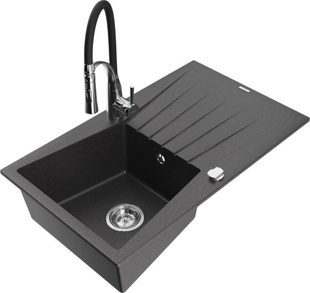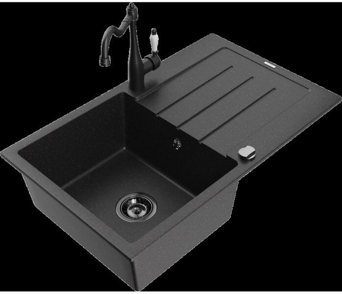 Mexen Cesar, 1 kamrás gránit mosogató csepptálcával 78x47 cm Telma konyhai csapteleppel, fekete, 6514-77-670200-00 Mosogató: Termékkód: 6514771010-77 Mérete: 775x470x200 mm Kamra mélysége: 180 mm Kamra méretei: 410x355 mm Lefolyó átmérője: ø90 mm Típus: 1 kamrás csepptálcával Típus: Az asztallapba süllyesztett Fekete szín Anyaga: gránit (80% gránit adalékanyag 20% gyanta