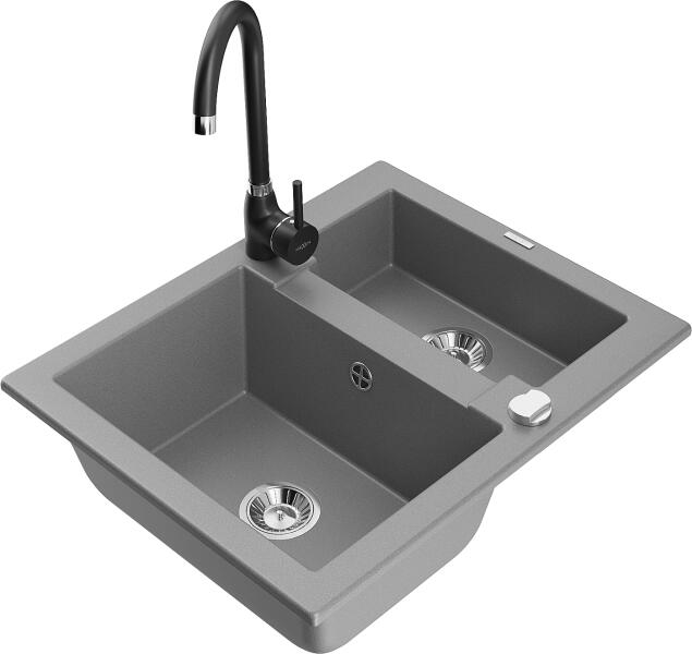 Mexen Carlos, gránit mosogató 582x475x177 mm, 1,5 kamrás és fekete Telma mosogató csaptelep, szürke, 6518-71-670200-70 Gyártó: Mexen Sorozat: Carlos Modell: 1,5-kamrás Beépítés: a munkalapba való beágyazáshoz Szín: szürke Mérete: 582x475x177 mm Kamra mélysége: 162 mm (nagyobb), 102 mm (kisebb) Kamra méretei: 395x272 mm (nagyobb), 375x182 mm (kisebb) A lefolyó átmérője: Ø