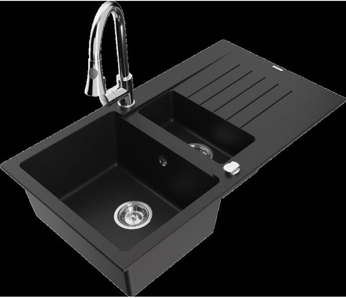 Mexen Tomas, gránit mosogató 800x500x190 mm, 2 kamrás és Duero króm csaptelep, szürke, 6516-71-671600-00 A konyhai mosogató műszaki adatai: Gyártó: Mexen Sorozat: Tomas Modell: 2-kamrás csepptálca nélkül Felszerelés: munkalapra Szín: szürke Felületkezelés: sima Hossza 800 mm Szélesség 500 mm Magasság: 190 mm Kamra mélysége: 180 mm (nagyobb), 180 mm (kisebb) Kamra mérete: