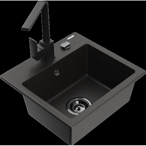 MOSOGATÓ: Egymedencés gránit mosogató, amely ideális kis konyhákba, mély medencével, fekete-szemcsés színben hozzáillő csapteleppel szettben! Tökéletes minőség, letisztult forma, mely minden stílusú konyhához tökéletesen illeszkedik. Külső mérete: 520x490mm A medence mérete: 410x360mm A mosogató mélysége: 190mm Súlya: 8,5 kg. CSAP: - Sárgaréz alapanyagból készült