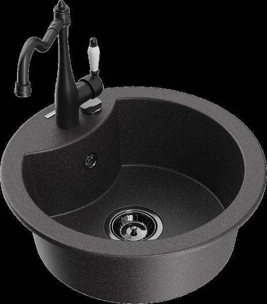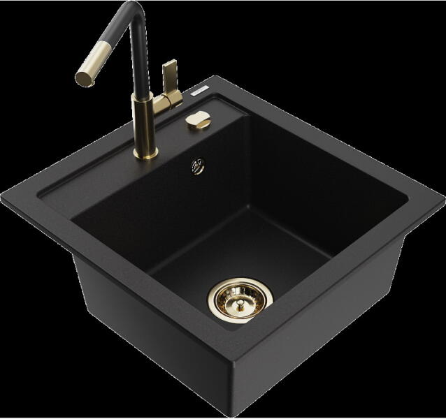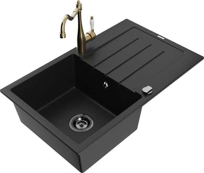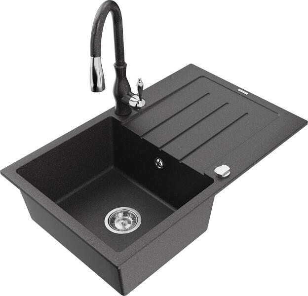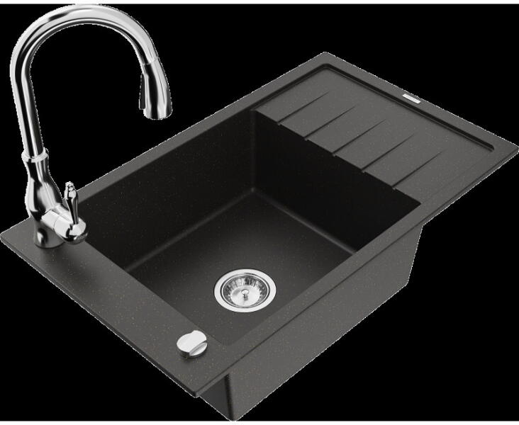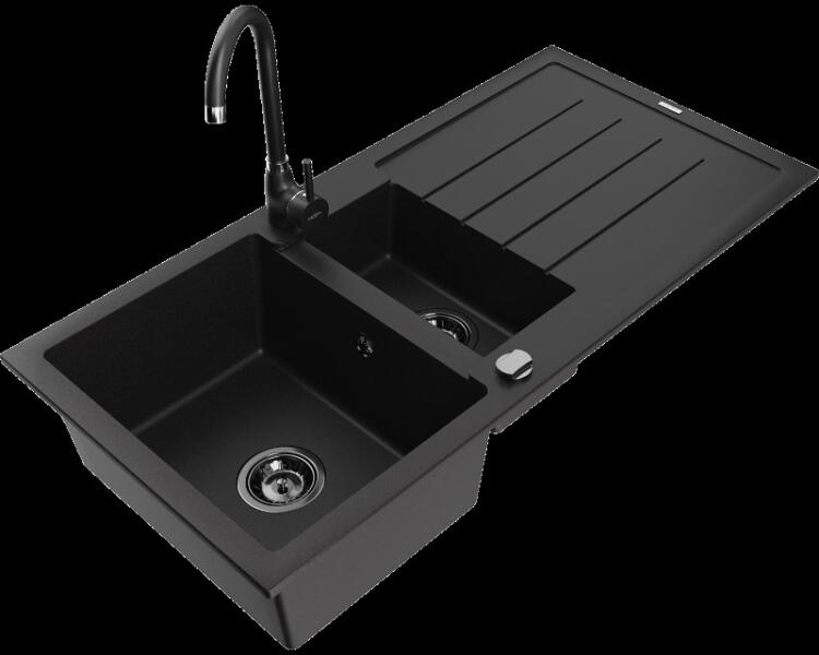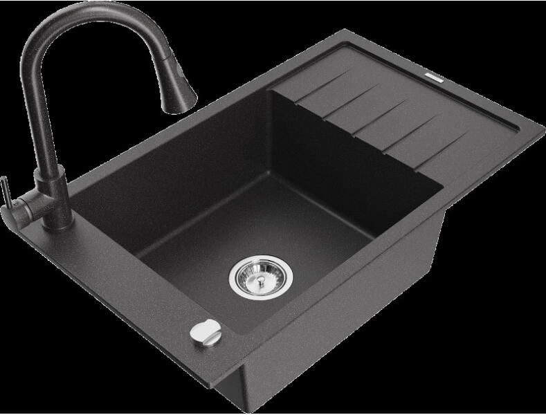 Mexen Pablo, gránit mosogató 752x436x161 mm, 1 kamrás és Carla mosogató csaptelep, fekete-ezüst metál, 6510-73-670700-00 Gyártó: Mexen Sorozat: Pablo Méretek: 752x436x161 mm Kamra mélysége: 151 mm Kamra méretei: 356x332 mm Lefolyó átmérője: ø90 mm Szín: fekete - ezüst metál Típus: 1 kamrás csepegtetővel Típus: felülről a pultba süllyesztve Anyaga: gránit (80% gránit a