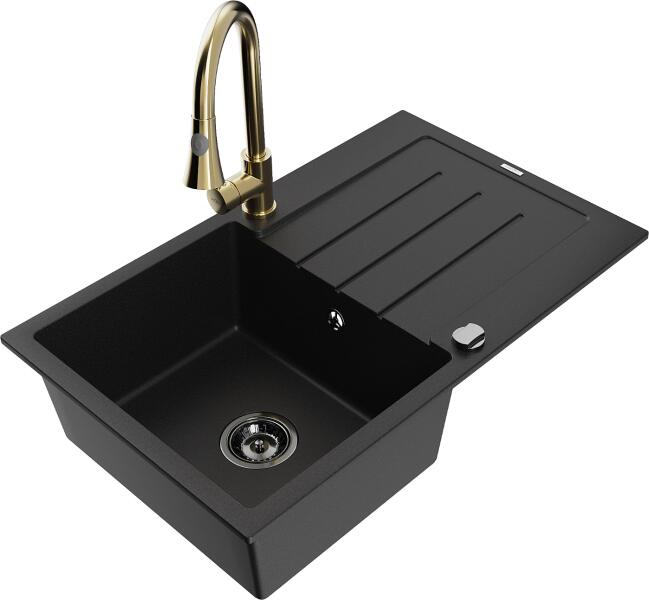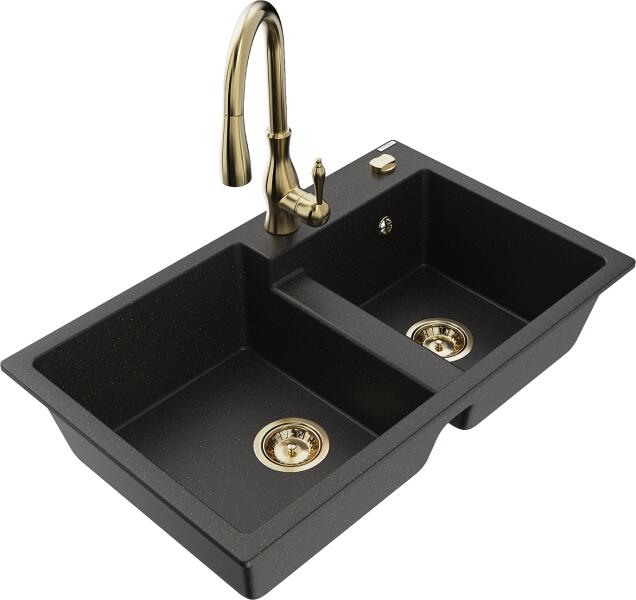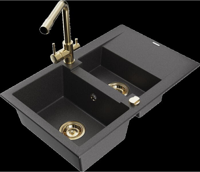 Mexen Tomas, gránit mosogató 800x500x190 mm, 2 kamrás és Savita mosogató csaptelep, fekete-arany metál, 6516-75-672601-50 A konyhai mosogató műszaki adatai: Gyártó: Mexen Sorozat: Tomas Modell: 2-kamrás csepptálca nélkül Beépítés: a munkalapba való beágyazáshoz Szín: fekete - arany metál Felület: sima Hossza 800 mm Szélesség 500 mm Magasság: 190 mm Kamra mélysége: 180