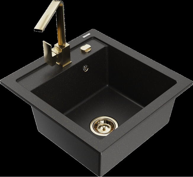 Mexen Elias, gránit mosogató gránit 795x480x200 mm, 1 kamrás, fekete-arany metál fekete szifonnal és fekete Rita mosogató csapteleppel, 6511-75-670300-70-B Gyártó: Mexen Sorozat: Elias Modell: 1 kamrás, rövid leeresztővel Felszerelés: munkalapra Szín: fekete - arany metál Felületkezelés: sima Hossza 795 mm Szélesség 480 mm Magasság: 200 mm Kamra mélysége: 190 mm Kamra méret