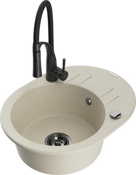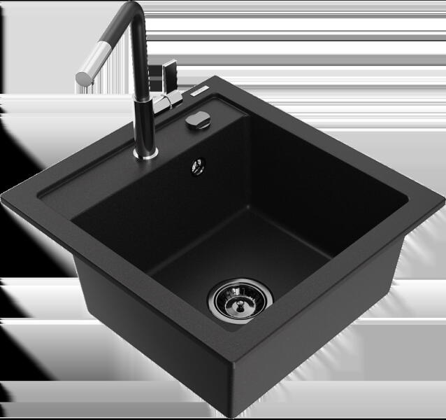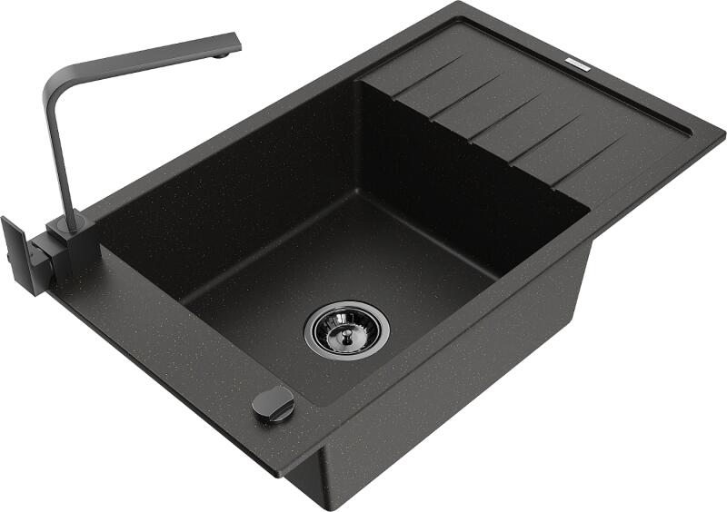 Mexen Elias, 1 kamrás gránit mosogató lefolyóval 795x480x200 mm fekete Duero csapteleppel, fekete - ezüst metál, 6511-73-671600-70 Elias konyhai mosogató: Szín: fekete - ezüst metál Mérete: 795x480x200 mm Kamra mélysége: 190 mm Kamra méretei: 465x420 mm Lefolyó átmérője: ø90 mm Típus: 1 kamrás, rövid csepegtetővel Típus: a pultba süllyesztve Anyaga: gránit (80% gránit ad