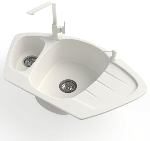 NERO Compact sarok gránit mosogató, ami egyben praktikus és impozáns látványelem is a konyhában. Tökéletes választás azokba a konyhákba, ahol a mosogató rész a sarokban lett kialakítva. Íves, de modern formatervezése nagyszerűen illik bármilyen stílusú konyhába. A mosogatón 2 lyuk lett kialakítva, egy a csaptelepnek és egy a beépíthető mosogatószer adagolónak vagy aut