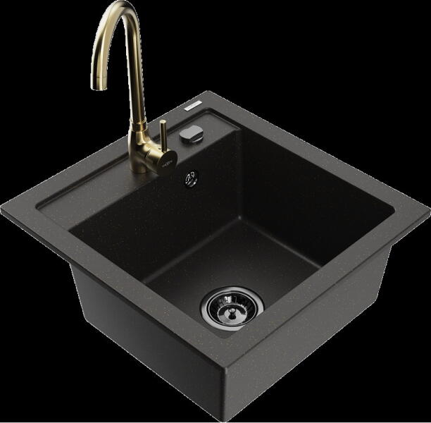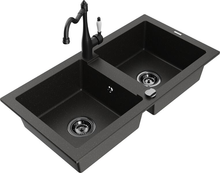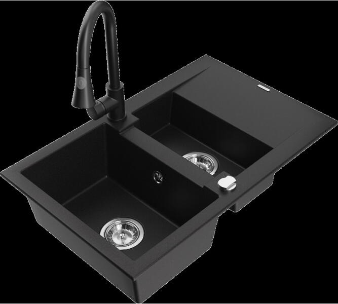 Mexen Mario, gránit mosogató 820x436x161 mm, 2-kamrás és mosogató csaptelep Carla, fekete-arany metál, 6504-75-670700-70-B Gyártó: Mexen Sorozat: Mario + Carlo Mosogató: Méretek: 820x436x161 mm Kamra mélysége: 151 mm Kamra méretei: 356x336 mm Lefolyó átmérője: ø90 mm Típus: 2 kamrás Típus: felülről az asztal munkalapjába süllyesztve Anyaga: gránit (80% gránit adalékanya