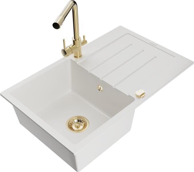 Mexen Bruno, 1 kamrás gránit mosogató lefolyóval 795x495x200 mm és Duero arany csapteleppel, fehér, 6513-20-671600-50 Mosogató: Mérete: 795x495x200 mm Kamra mélysége: 190 mm Kamra méretei: 440x360 mm Lefolyó átmérője: ø90 mm Típus: 1 kamrás csepegtetővel Típus: a munkalapba süllyesztve Fehér szín Anyaga: gránit (80% gránit adalékanyag 20% gyanta) Túlfolyó lyuk: igen Ny