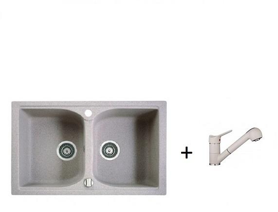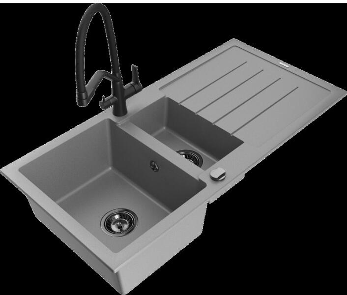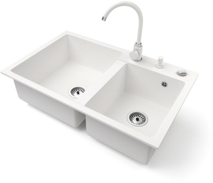 NERO Palazzo gránit mosogatótálca fehér színben csapteleppel, automata dugóemelővel és adagolóval. A kétmedencés mosogatótálcák 21. századi csúcsmodellje, ami két nagyméretű medencéjével és különleges kialakításával minden konyha tökéletes eleme lehet. Az asszimetrikus kialakításnak köszönhetően a kisebb medence fölött egy praktikus perem helyezkedik el, ahol he