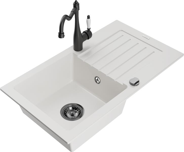 Mexen Pablo, gránit mosogató 752x436x161 mm, 1 kamrás és mosogató csaptelep Carla, fehér, 6510-20-670700-70 Gyártó: Mexen Sorozat: Pablo Méretek: 752x436x161 mm Kamra mélysége: 151 mm Kamra méretei: 356x332 mm Lefolyó átmérője: ø90 mm Fehér szín Típus: 1 kamrás csepegtetővel Típus: felülről a pultba süllyesztve Anyaga: gránit (80% gránit adalékanyag 20% gyanta) Túlfol