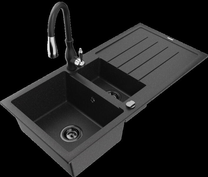 Mexen Tomas, gránit mosogató 800x500x190 mm, 2 kamrás és fekete Telma csaptelep, fekete foltos, 6516-76-670200-70 A konyhai mosogató műszaki adatai: Gyártó: Mexen Sorozat: Tomas Modell: 2-kamrás csepptálca nélkül Felszerelés: munkalapra Szín: fekete foltos Felület: sima Hossza 800 mm Szélesség 500 mm Magasság: 190 mm Kamra mélysége: 180 mm (nagyobb), 180 mm (kisebb) Kamra mér