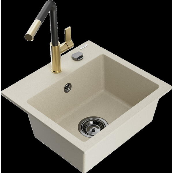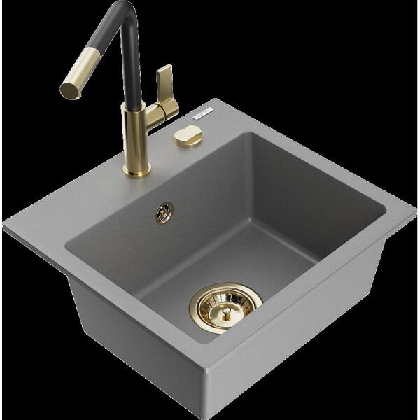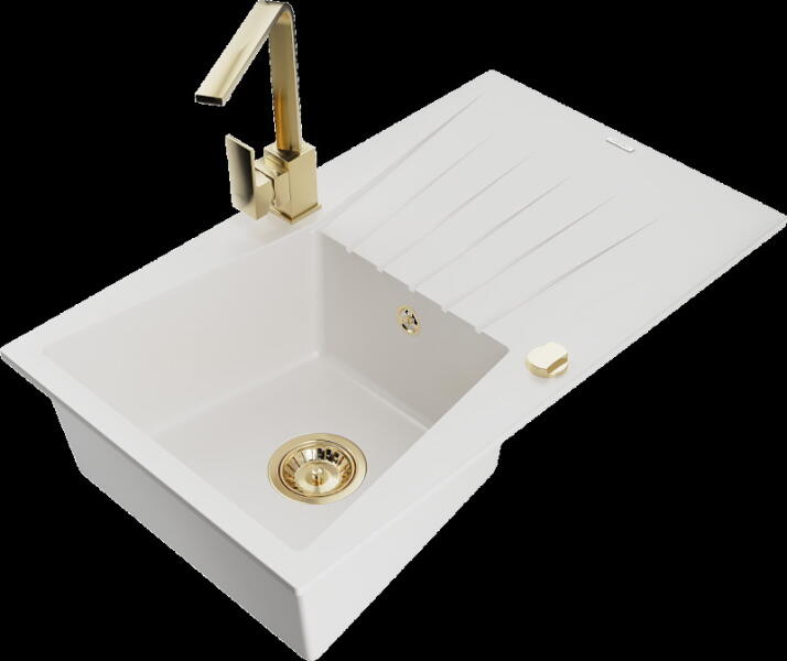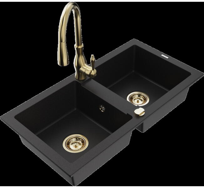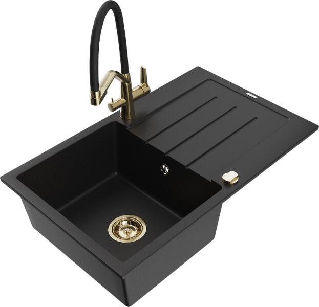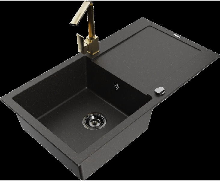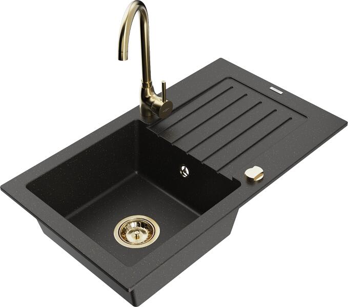Mexen Pablo, 1 kamrás gránit mosogató csepegtetővel 75x44 cm Telma konyhai csapteleppel, fekete-arany, 6510-75-670200-50 Mosogató: Termékkód: 6510751010-75 Mérete: 752x436x161 mm Kamra mélysége: 151 mm Kamra méretei: 356x332 mm Lefolyó átmérője: ø90 mm Típus: 1 kamrás csepptálcával Típus: Az asztallapba süllyesztett Szín: fekete-arany Anyaga: gránit (80% gránit adalékanya
